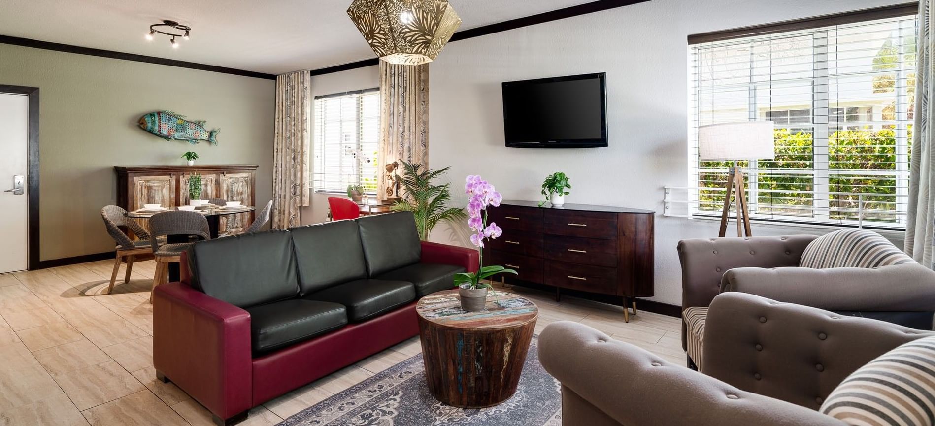 Your cozy, colorful hideaway awaits! This suite is the perfect home base for your Miami adventures. It's got a comfy queen bed, a full kitchen for late-night munchies, and a laid-back living area.