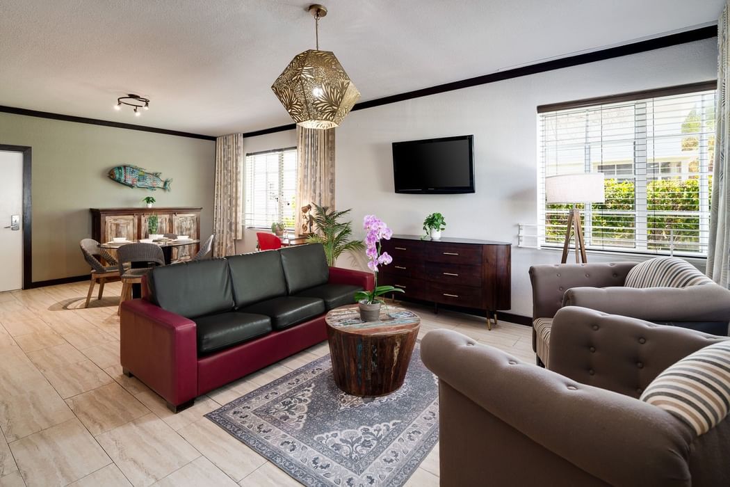Need more space to get your chill on? This is it. Our Courtyard View One Bedroom Double Queen Suite has two queen beds piled high with pillows, a full kitchen for your cocktail-making adventures, and a living area with a sofa bed forr your plus-one.